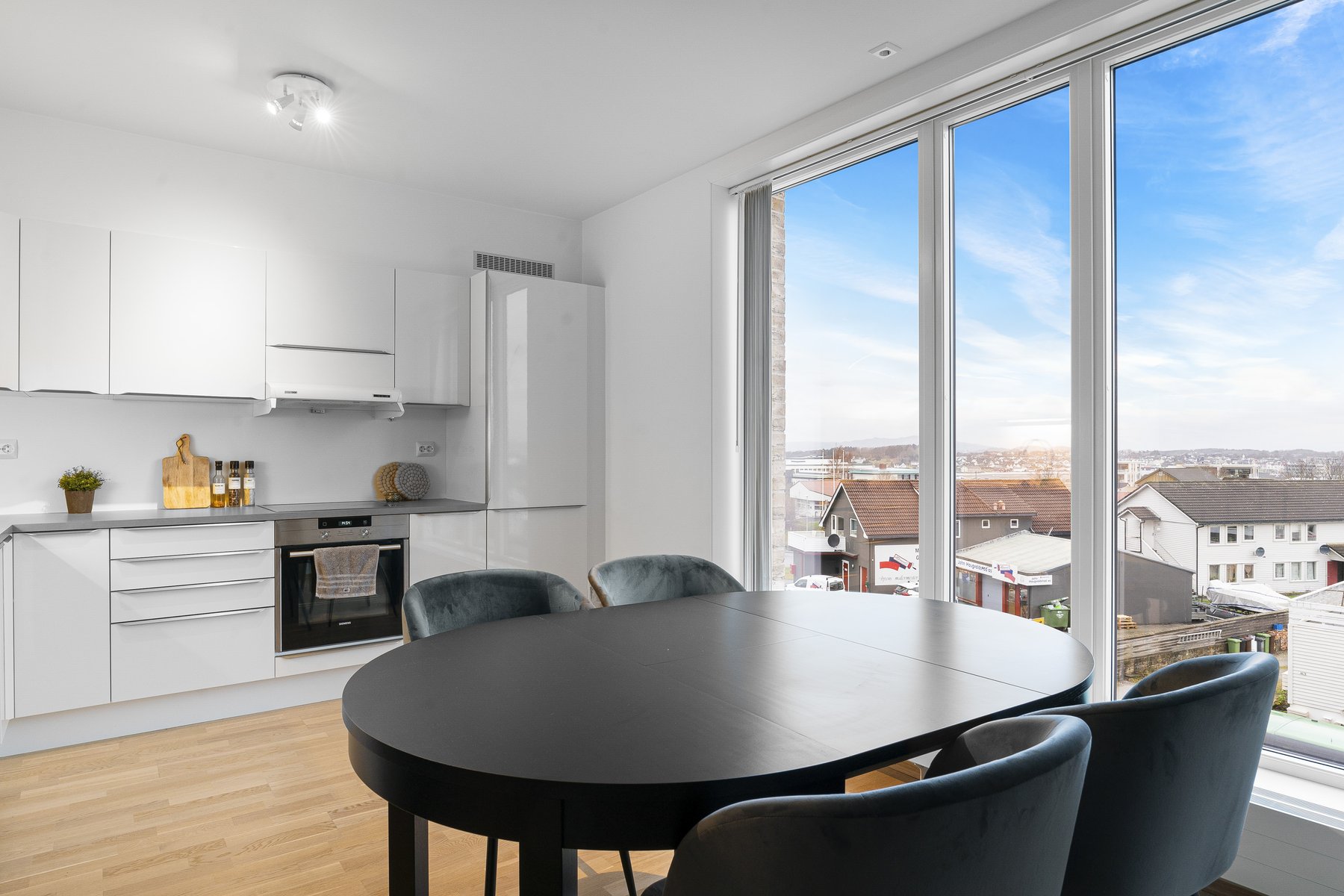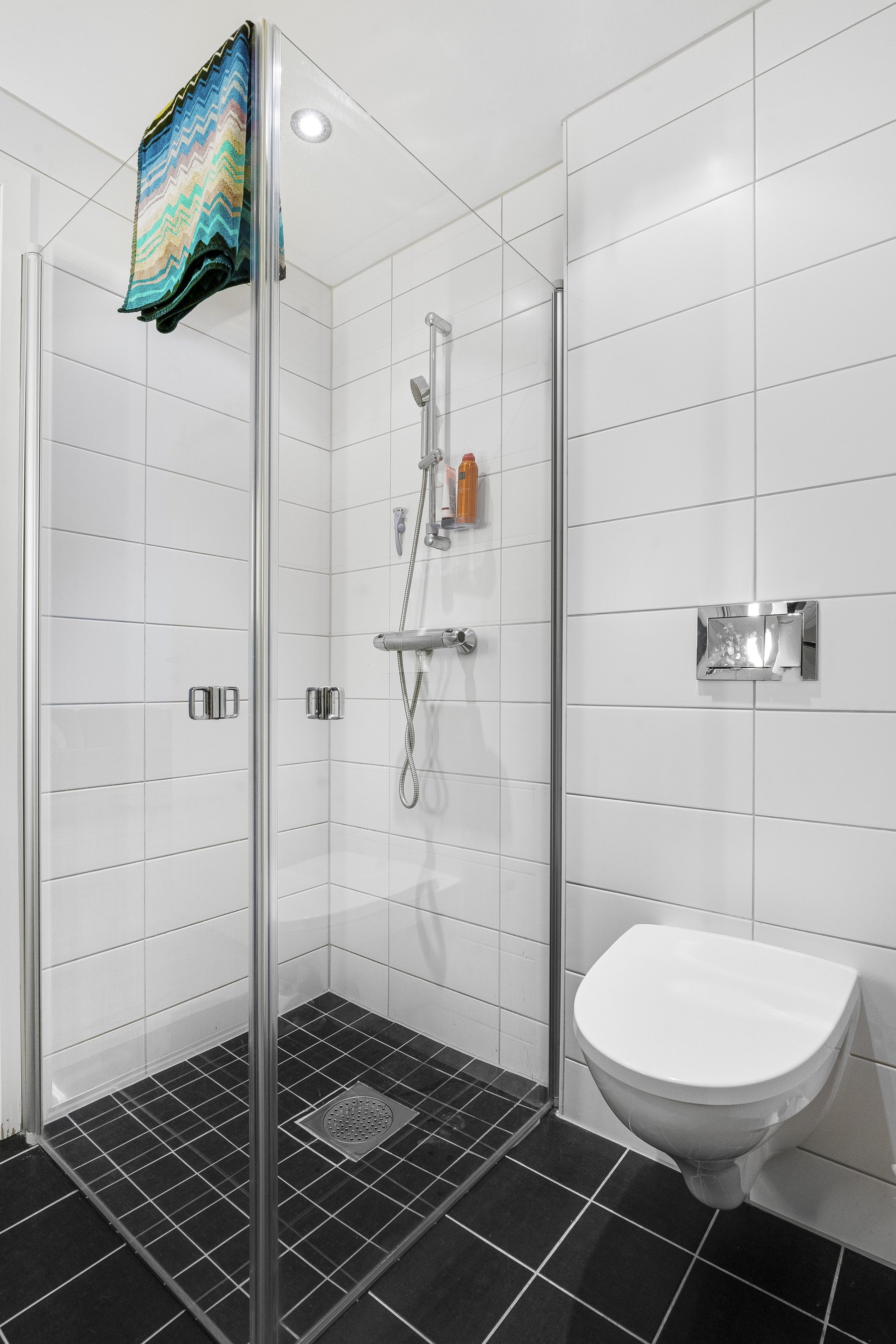 Integrerte hvitevarer (kjøleskap, komfyr med koketopp, oppvaskmaskin) samt kombinert vaskemaskin/tørketrommel på bad